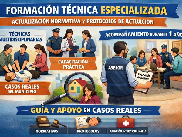 Ofrecemos formación técnica especializada, con actualización normativa, protocolos de actuación y técnicas de intervención multidisciplinaria, así como acompañamiento práctico durante un año, supervisando casos reales del municipio.